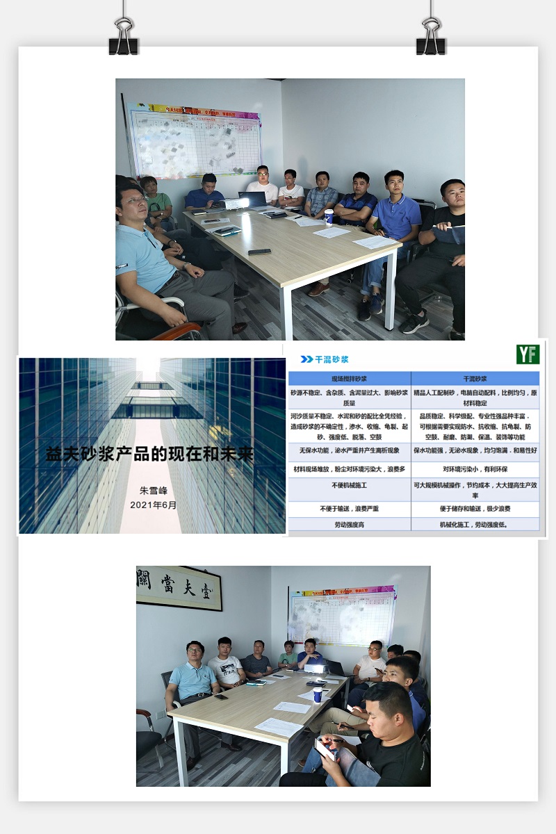 7月14日下午銷售部每周例會(huì)結(jié)束后,又請(qǐng)實(shí)驗(yàn)室朱主任為銷售部進(jìn)行產(chǎn)品知識(shí)培訓(xùn)。此次朱主任特意準(zhǔn)備了35頁的精美PPT,培訓(xùn)主題是“益夫砂漿產(chǎn)品的現(xiàn)在和未來”,內(nèi)容包括對(duì)公司現(xiàn)有產(chǎn)品的成分、性能、施工工藝、產(chǎn)品之間優(yōu)劣勢(shì)對(duì)比、現(xiàn)場(chǎng)常見產(chǎn)品問題的展示并給出解決方案、對(duì)市面上新型產(chǎn)品進(jìn)行分析、對(duì)公司未來的產(chǎn)品發(fā)展指出方向。PPT內(nèi)容附上現(xiàn)場(chǎng)圖片和施工視頻,圖文結(jié)合,直觀易懂。從2020年起,砂漿的規(guī)格型號(hào)就發(fā)生了改變,朱主任在培訓(xùn)時(shí)針對(duì)型號(hào)的變化做出解釋,這方便業(yè)務(wù)員日后與工地進(jìn)行說明。培訓(xùn)結(jié)束后,大家熱烈鼓掌,對(duì)朱主任細(xì)致全面的培訓(xùn)表示感謝,并表示此類培訓(xùn)以后能夠多多開展。