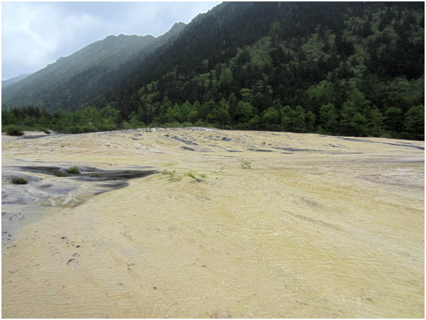 金沙鋪地金光閃爍,溪水漫過一大片鱗狀乳黃色鈣化巖,傾瀉而下,氣勢磅礴。我們忘情在每一個風(fēng)景線,哪怕中途細雨蒙蒙,也是意猶未盡。