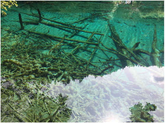 這是最著名的五花海,五花海的底部景觀妙不可言,湖水一邊是翠綠色的,一邊是湖綠色的,湖底的枯樹由于鈣化,變成一叢叢燦爛的珊瑚,在陽光的照射下,五光十色,非常迷人。