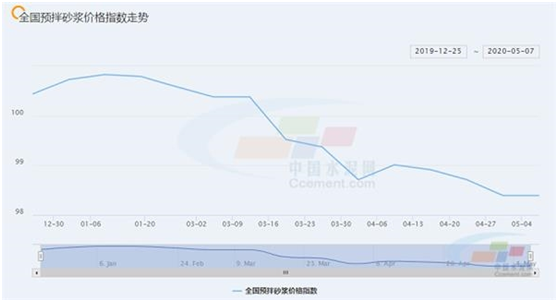 指數(shù)基期2019年12月18日為100點,5月7日,砂漿價格指數(shù)為98.39點,今年以來價格持續(xù)回落。